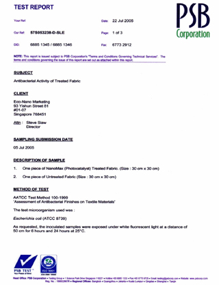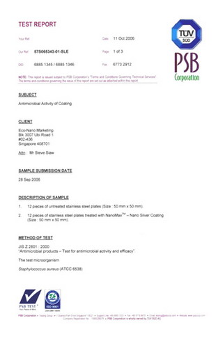 新加坡TüV SüD PSB-銀康二氧化鈦的檢測(cè)報(bào)告 檢測(cè)表明:大腸埃希氏菌的殺菌率在24小時(shí)內(nèi)高達(dá)99.96% | |