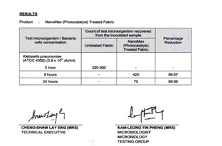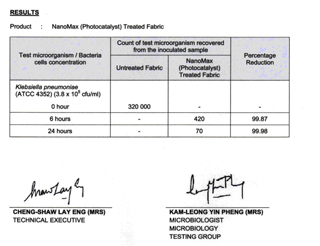 新加坡TüV SüD PSB-銀康二氧化鈦的檢測(cè)報(bào)告 檢測(cè)表明:肺炎菌的殺菌率在24小時(shí)內(nèi)高達(dá)99.98% | |