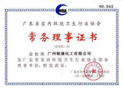 我公司于2010年4月25日獲得《廣東省室內(nèi)環(huán)境衛(wèi)生行業(yè)協(xié)會常務(wù)理事證書》,正式成為廣東省室內(nèi)環(huán)境衛(wèi)生行業(yè)協(xié)會常務(wù)理事單位。