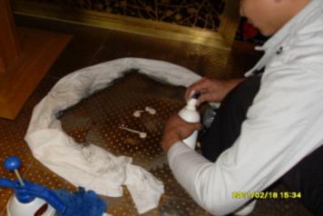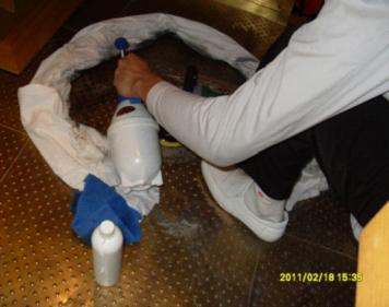 場地保護:因施工打磨時會產生少量揚塵和濺沫,故用舊布圍住四周作好防護,減輕對非工作區(qū)域的影響。