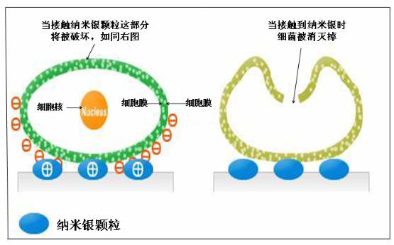 帶正電荷的納米銀顆粒接觸到帶負電荷的細菌細胞后,會相互吸附,它能有效擊穿細胞膜,在細胞內發(fā)生反應,造成蛋白質凝固,使細菌合成酶的活性遭到破壞,干擾細菌DNA的合成,使細菌喪失分裂增殖能力而死亡;與此同時銀離子和蛋白質的結合還破壞了細菌的呼吸系統,物質傳輸系統。銀離子殺死細菌后,又會從細菌的尸體游離出來,沒有任何消耗,仍保持原有的抗菌能力,因此納米銀的抗菌能力可長期有效。通過納米技術處理后的銀表面急劇增大,能擴大與病菌和真菌接觸的表面積,加強了抗菌和抗真菌的功效。如下圖所示: