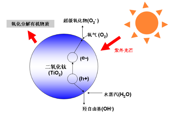 銀康的光觸媒二氧化鈦在紫外光照射條件下起作用,它能在室溫下分別與水蒸氣和氧氣發(fā)生反應產生羥自由基和超級氧化物,而羥自由基和超級氧化物具有超強的氧化性,能氧化分解空氣中的有機物質,可使微生物體內大分子的核酸、蛋白質和DNA等發(fā)生過氧化反應,并導致細胞不可逆的直接損傷而死亡,最終將細菌氧化成CO2、H2O和微量無機鹽,實現了零環(huán)境污染的綠色消除微生物污染的目的。 如下圖所示: